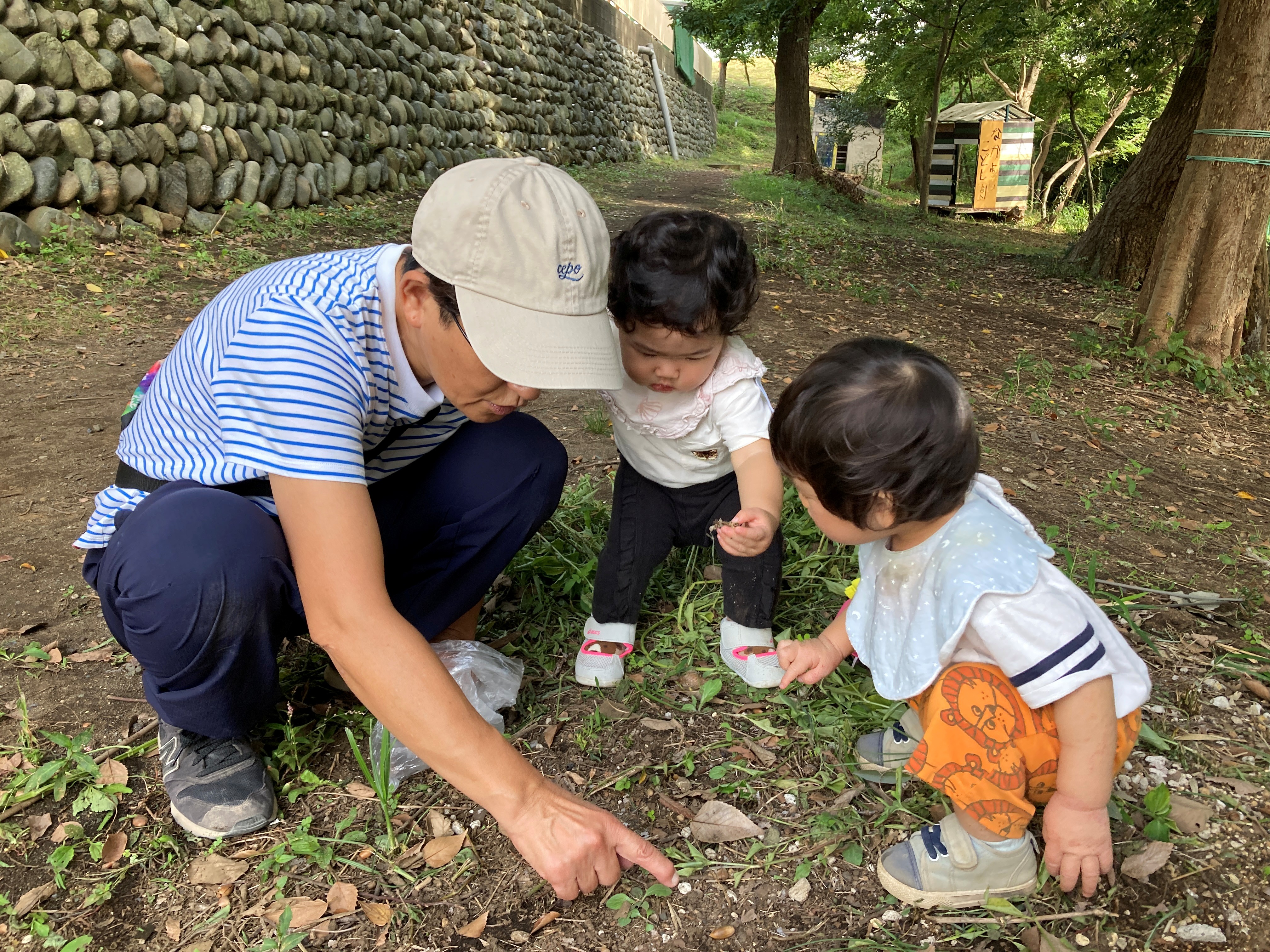 朝のお休み調べ前のひと時、各クラスを覗きながら歩いていると色々な場面に出会います。ダンゴムシを瓶の中に集めて「32匹いるよ!」と見せに来てくれるCちゃん。青虫をみつけ、いつサナギになるのか待ちわびている年中さん。飼育中のメダカの赤ちゃんがたくさん生まれた年少さんは、可愛いね~とお部屋でじっくり観察中です。のんびりデッキでは年長数人が協力しながら木の枝を抑えて実を採り、集めて並べていました。園庭では泥団子作りや水遊びを服が濡れるのもお構いなしに遊んでいる子ども達の姿があります。